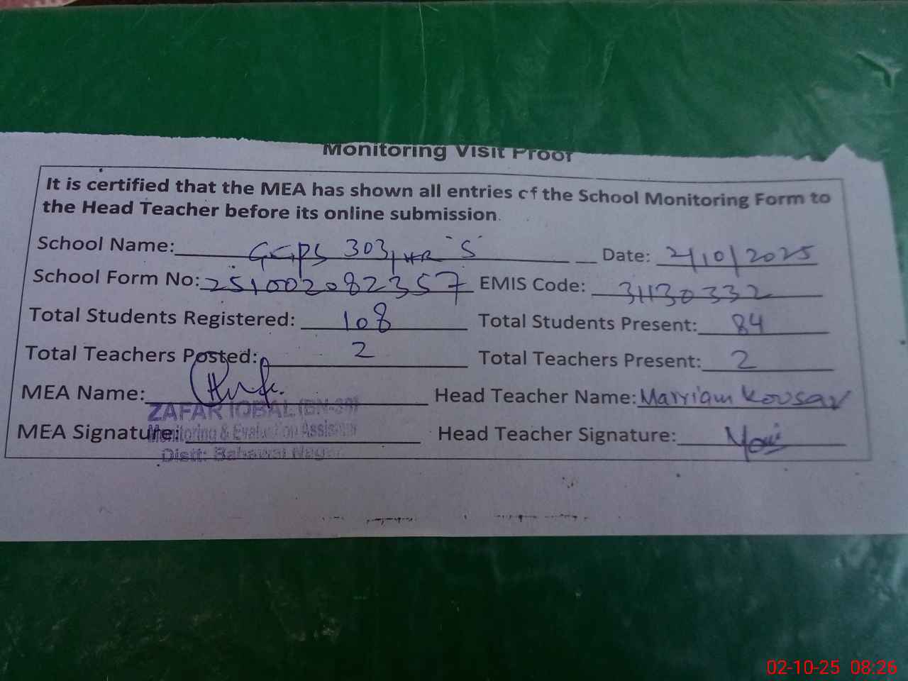 | Monitoring Date: 02-10-2025 | Start Time: 02-10-2025 08:10 AM | End Time: 02-10-2025 08:27 AM | Name of MEA: Za**** Iq**** BN**** | |