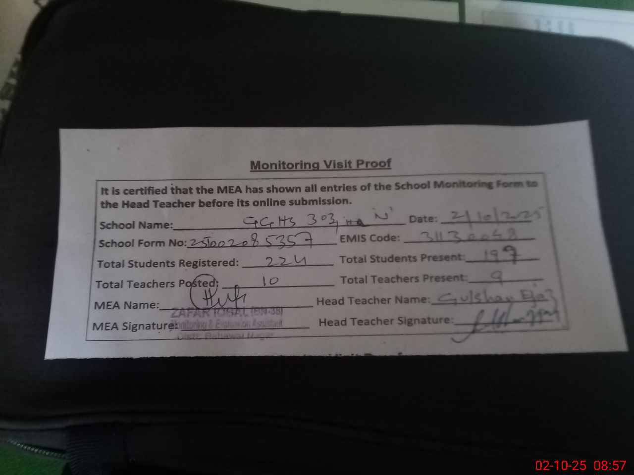 | Monitoring Date: 02-10-2025 | Start Time: 02-10-2025 08:34 AM | End Time: 02-10-2025 08:57 AM | Name of MEA: Za**** Iq**** BN**** | |