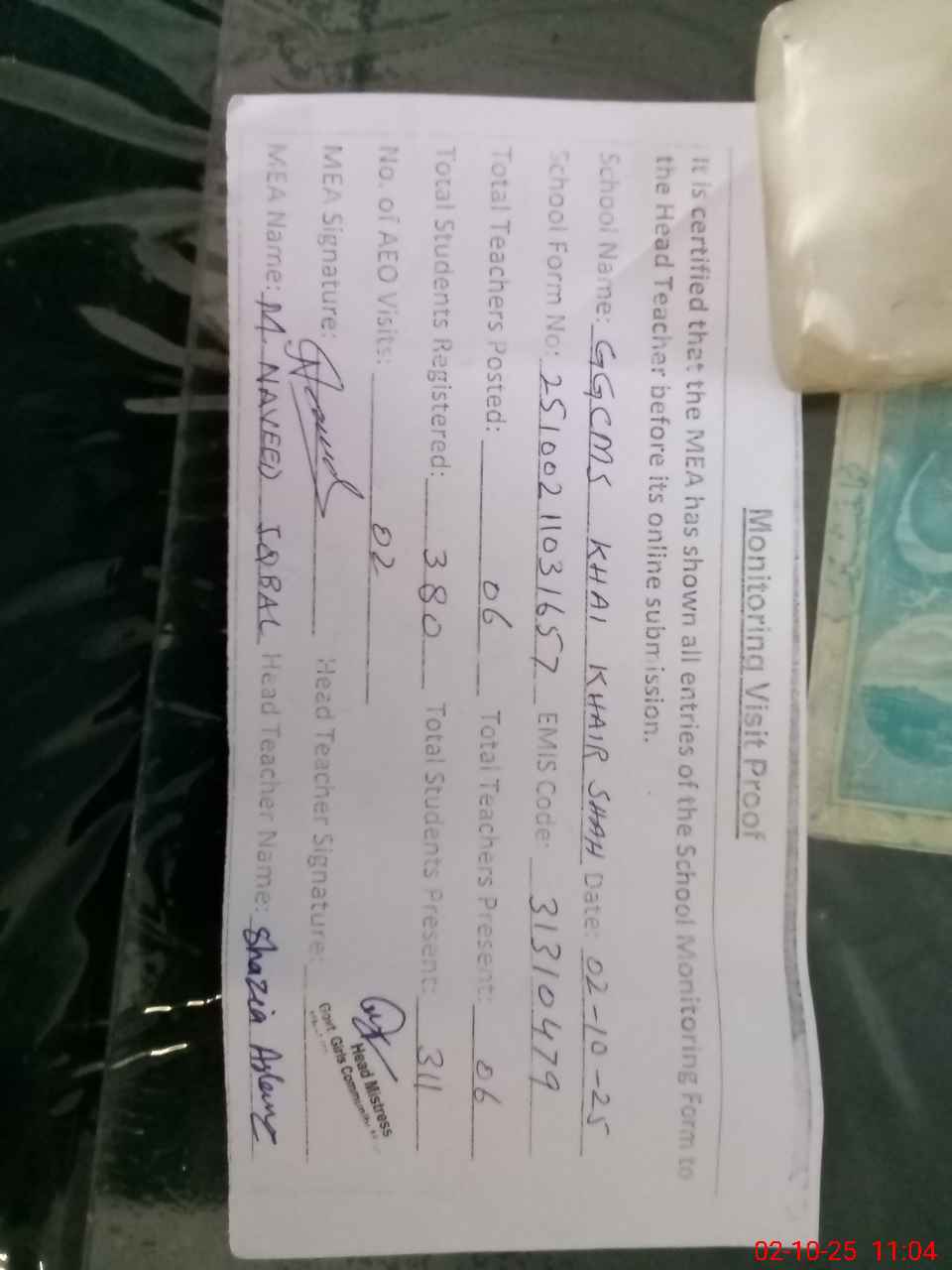| Attendance Register | Head Teacher | MEA with School | Visit Proof |