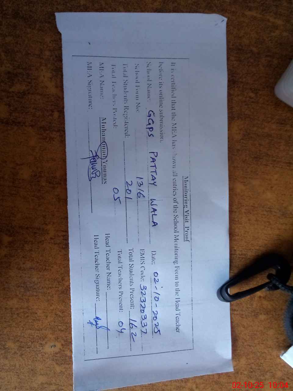 | Attendance Register | Head Teacher | MEA with School | Visit Proof |
