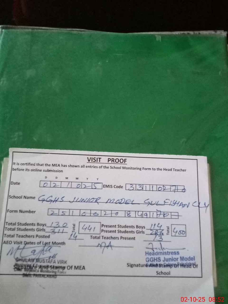 | Attendance Register | Head Teacher | MEA with School | Visit Proof |