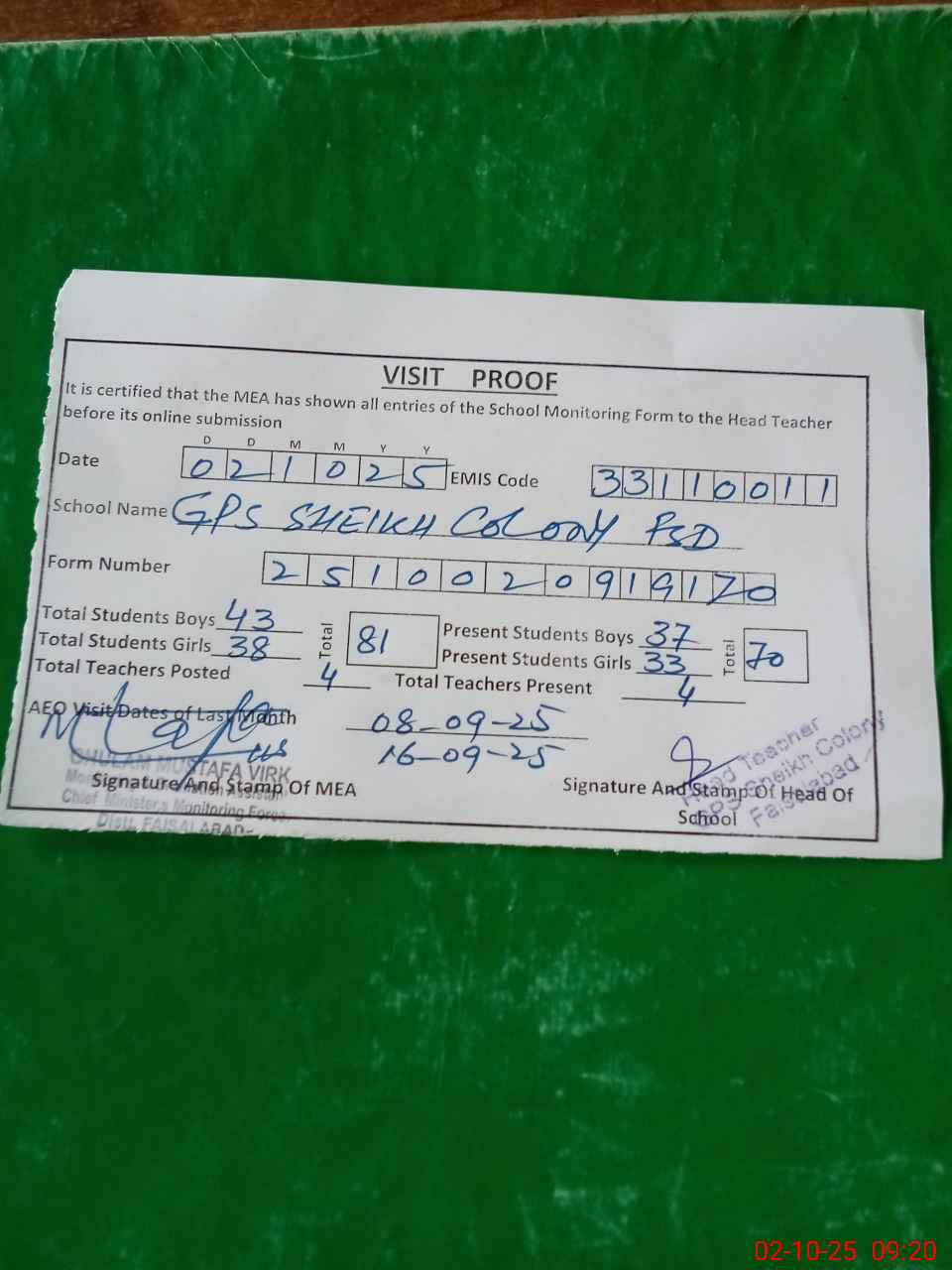 | Attendance Register | Head Teacher | MEA with School | Visit Proof |