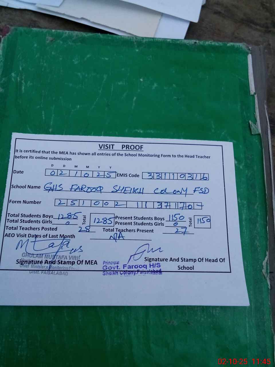 | EMIS Code: 33110316 | Name of School: GHS FAROOQ SHEIKH COLONY FSD | |||