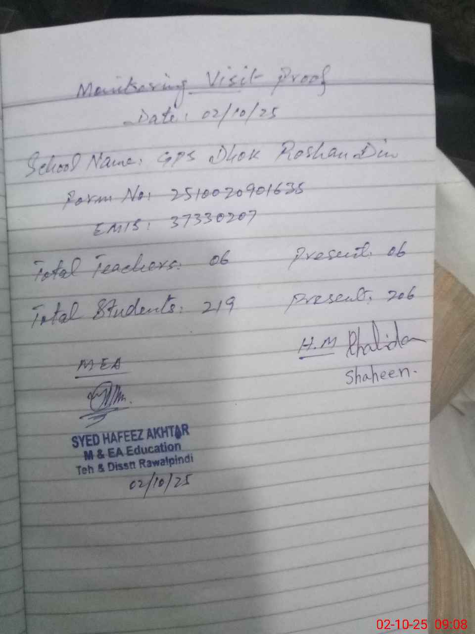 | Monitoring Date: 02-10-2025 | Start Time: 02-10-2025 08:49 AM | End Time: 02-10-2025 09:18 AM | Name of MEA: Sy**** Ha**** Ak**** | |