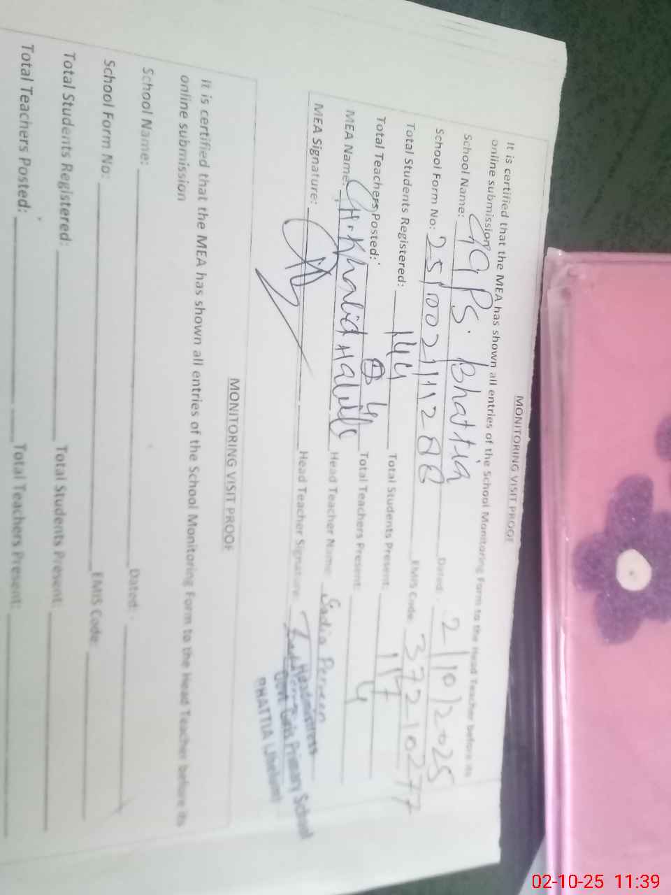 | Certified that this School was Inspected by the Undersigned MEA/DMO Today and the Information Stated Above is as Per Record. | |||||