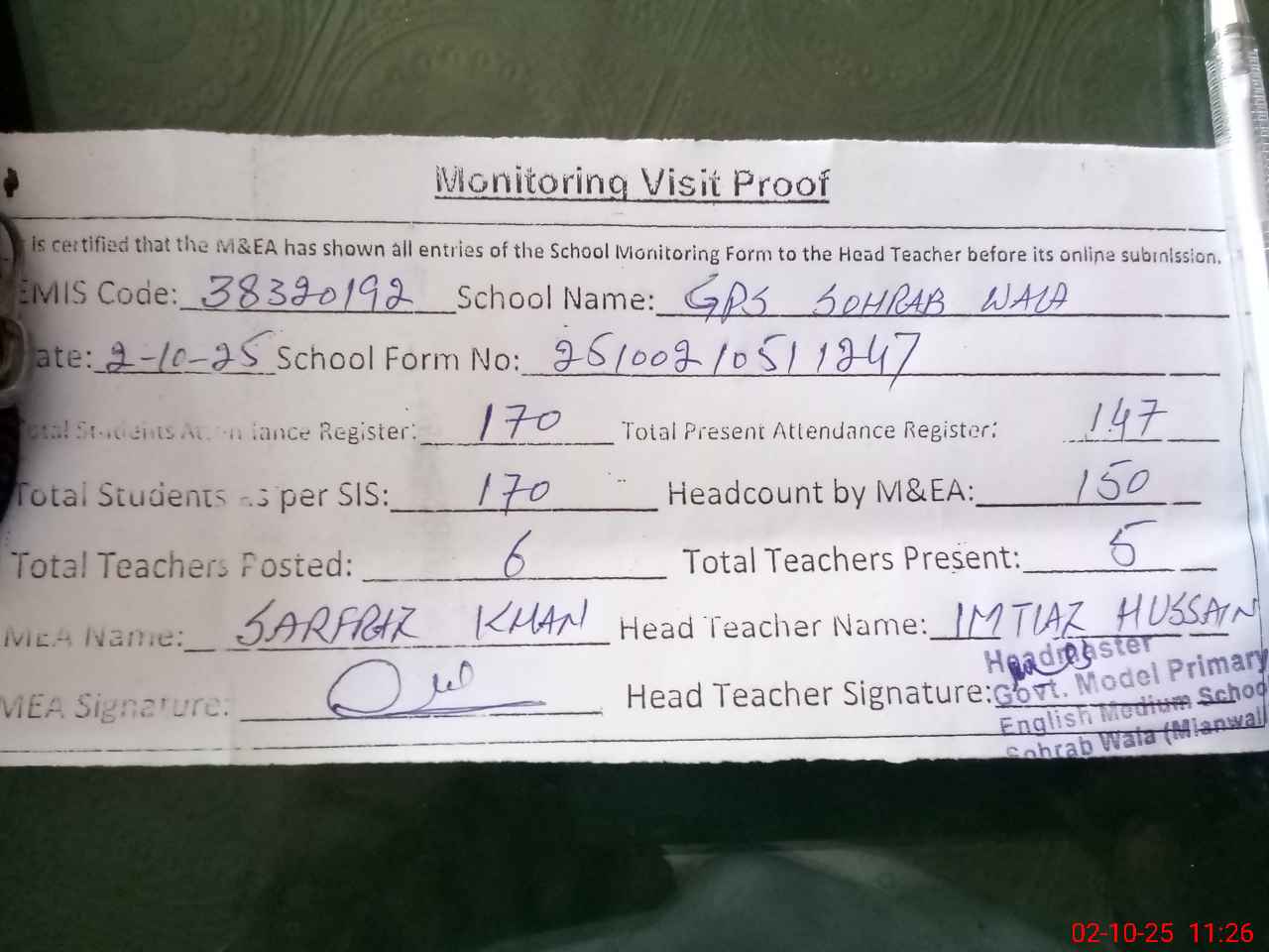 | Attendance Register | Head Teacher | MEA with School | Visit Proof |