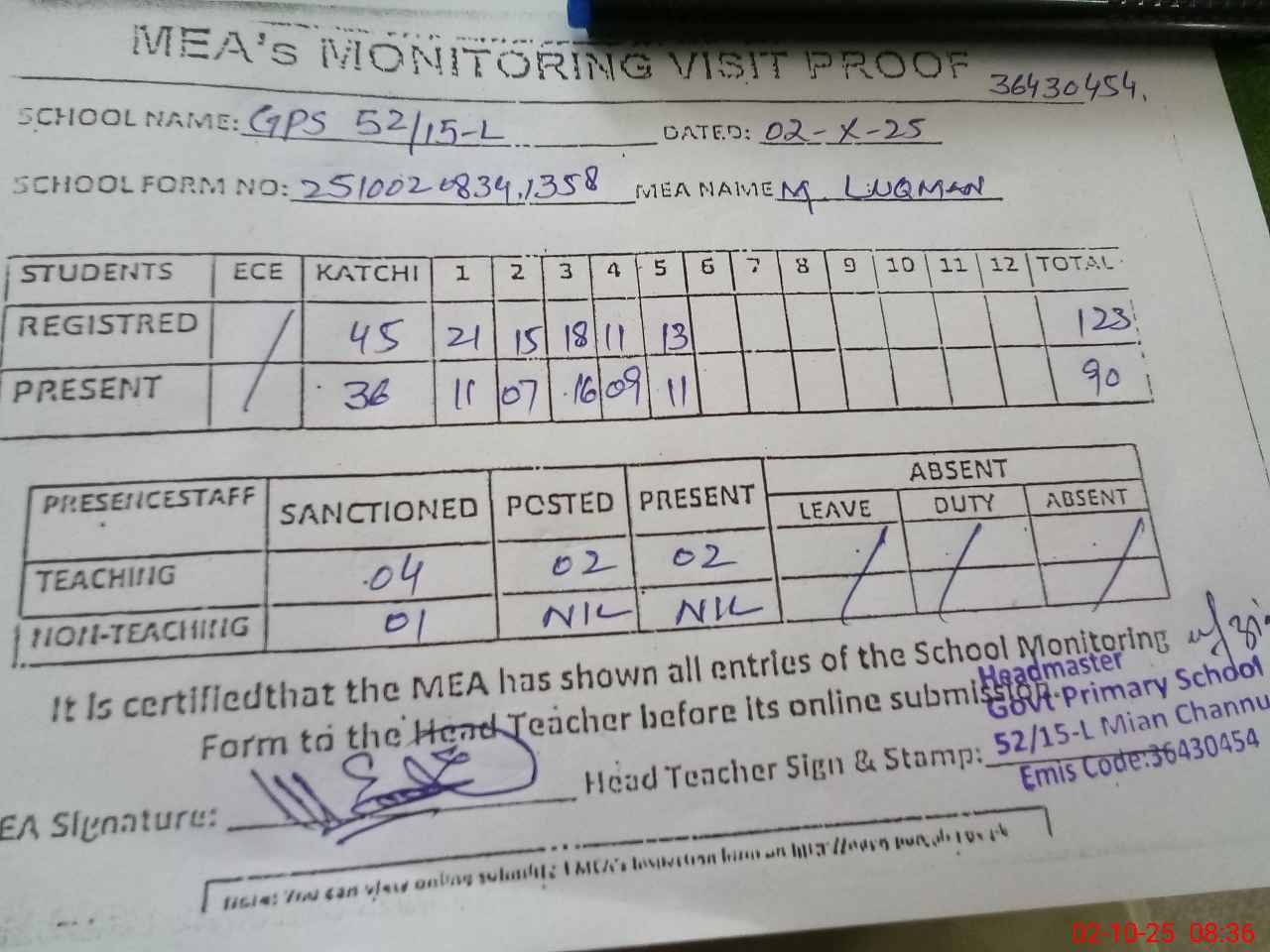 | Attendance Register | Head Teacher | MEA with School | Visit Proof |