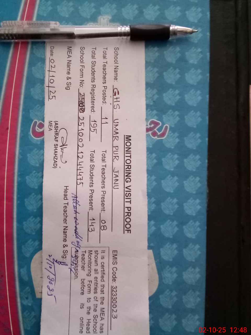 | Attendance Register | Head Teacher | MEA with School | Visit Proof |