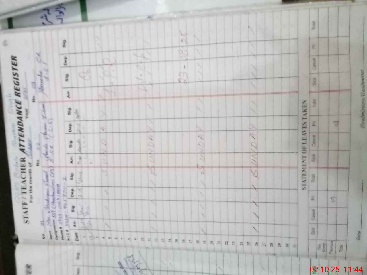| CNIC | Full Name | Designation | R/C | Absence During Last Calender Month |