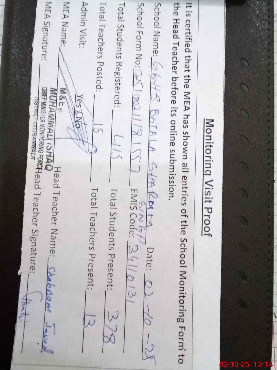 | Attendance Register | Head Teacher | MEA with School | Visit Proof |