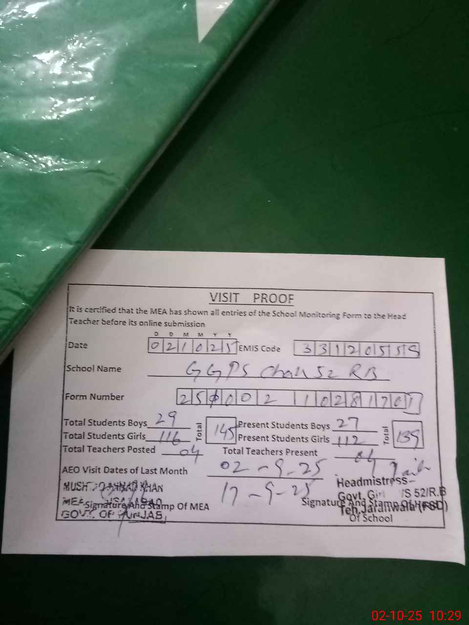| Attendance Register | Head Teacher | MEA with School | Visit Proof |