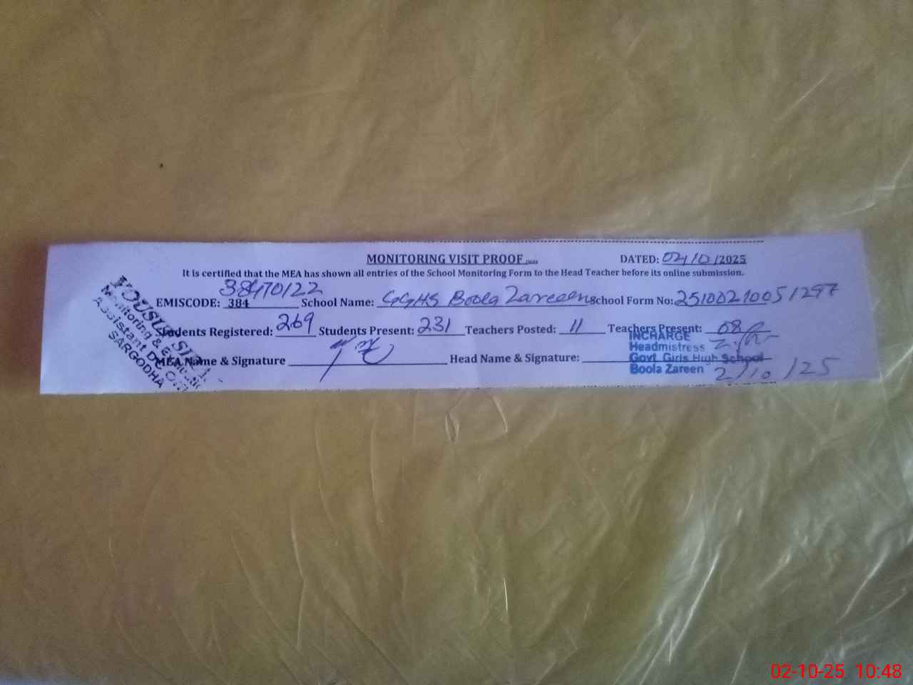 | Certified that this School was Inspected by the Undersigned MEA/DMO Today and the Information Stated Above is as Per Record. | |||||
