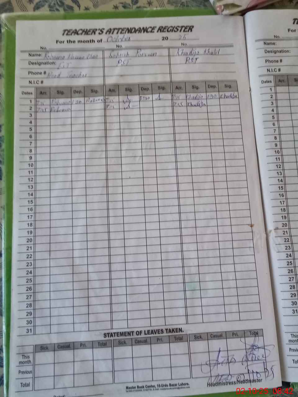 | CNIC | Full Name | Designation | R/C | Absence During Last Calender Month |