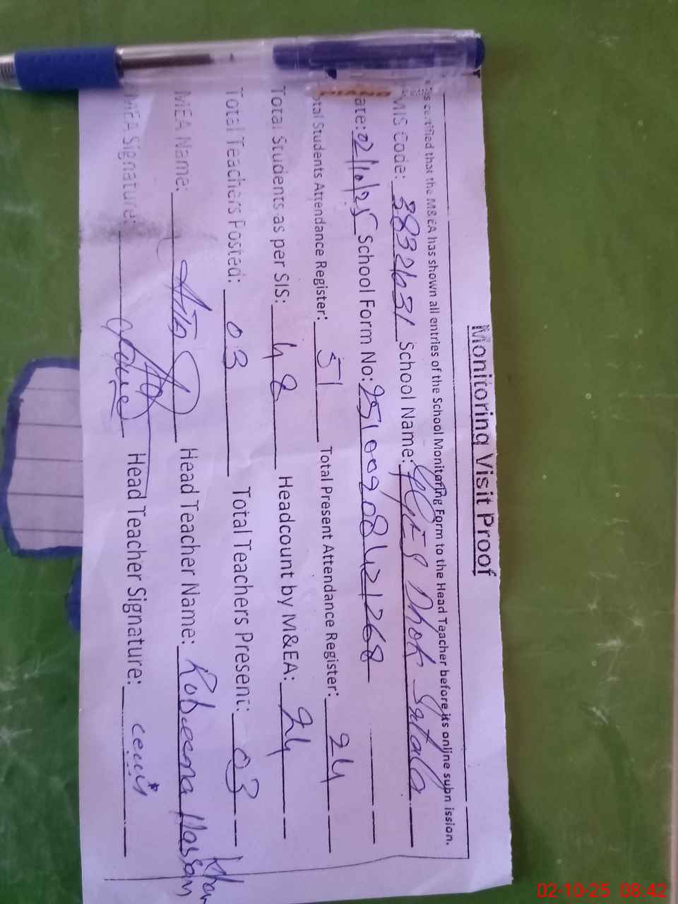 | Attendance Register | Head Teacher | MEA with School | Visit Proof |