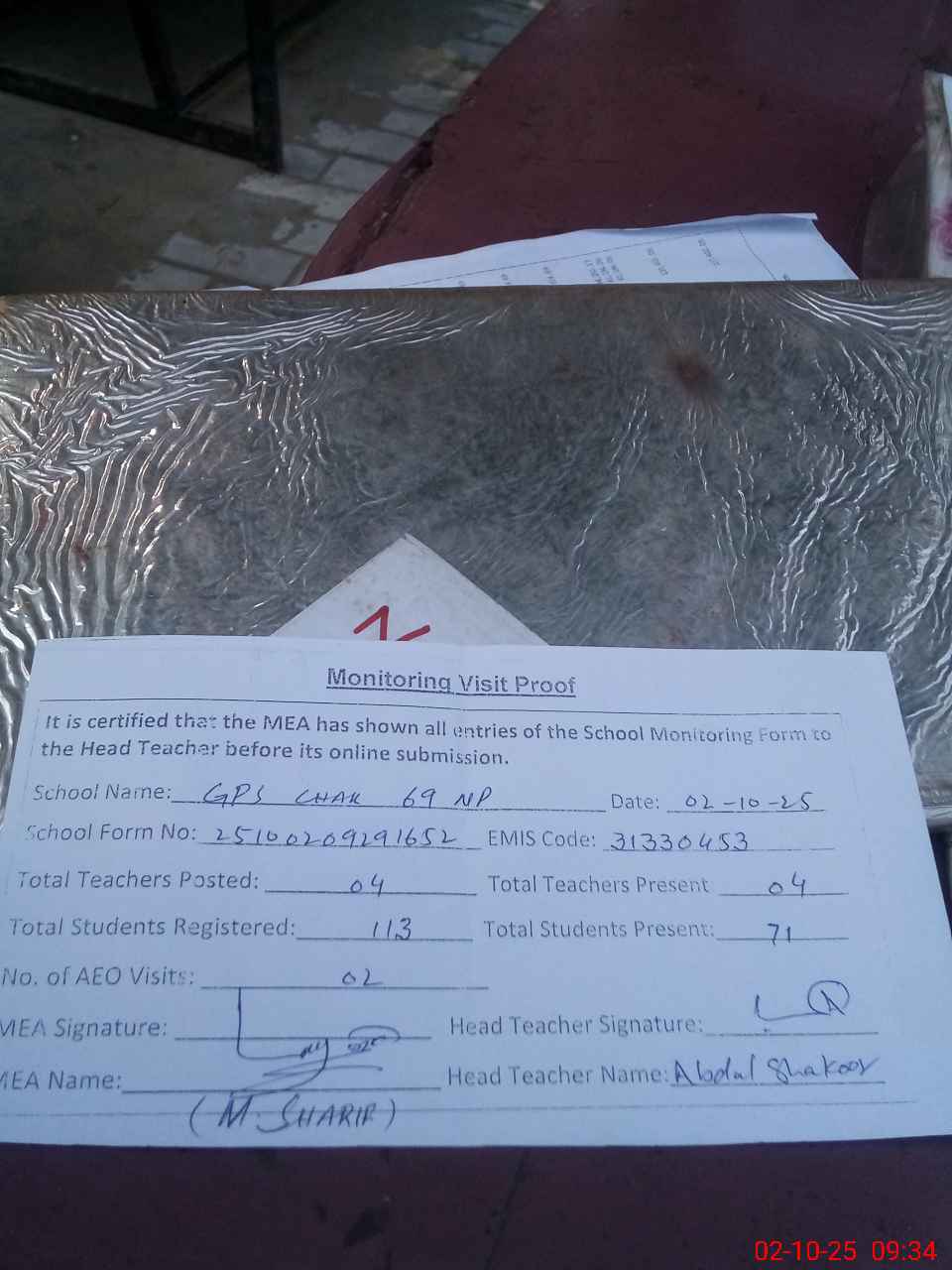 | EMIS Code: 31330453 | Name of School: GPS CHAK NO. 69/NP | |||