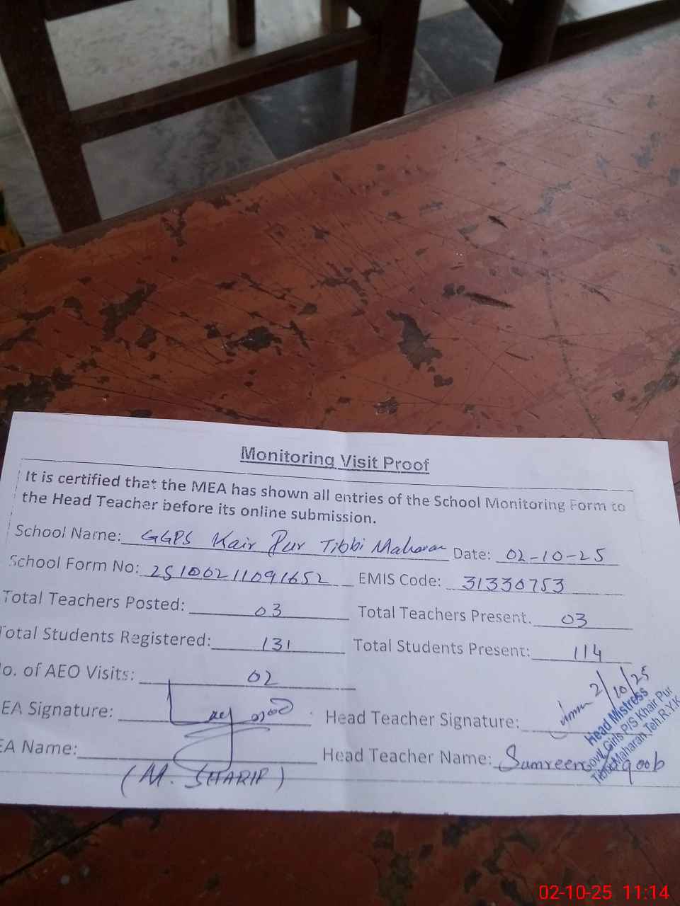 | Attendance Register | Head Teacher | MEA with School | Visit Proof |