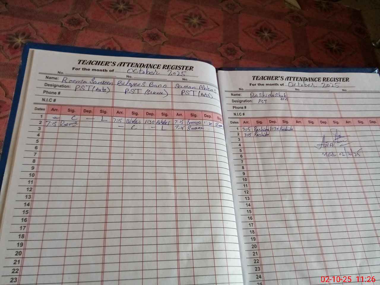 | CNIC | Full Name | Designation | R/C | Absence During Last Calender Month |