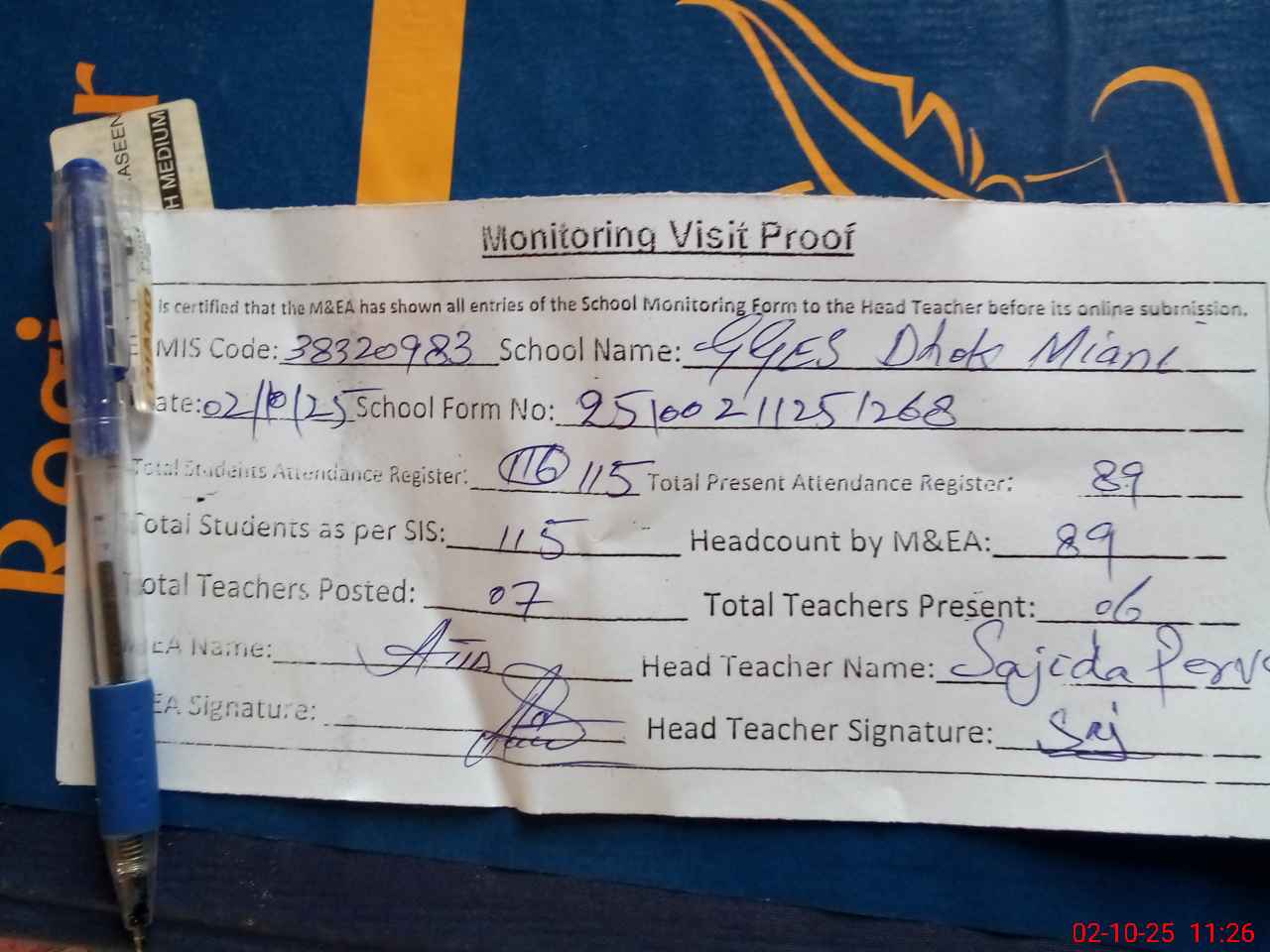 | Attendance Register | Head Teacher | MEA with School | Visit Proof |