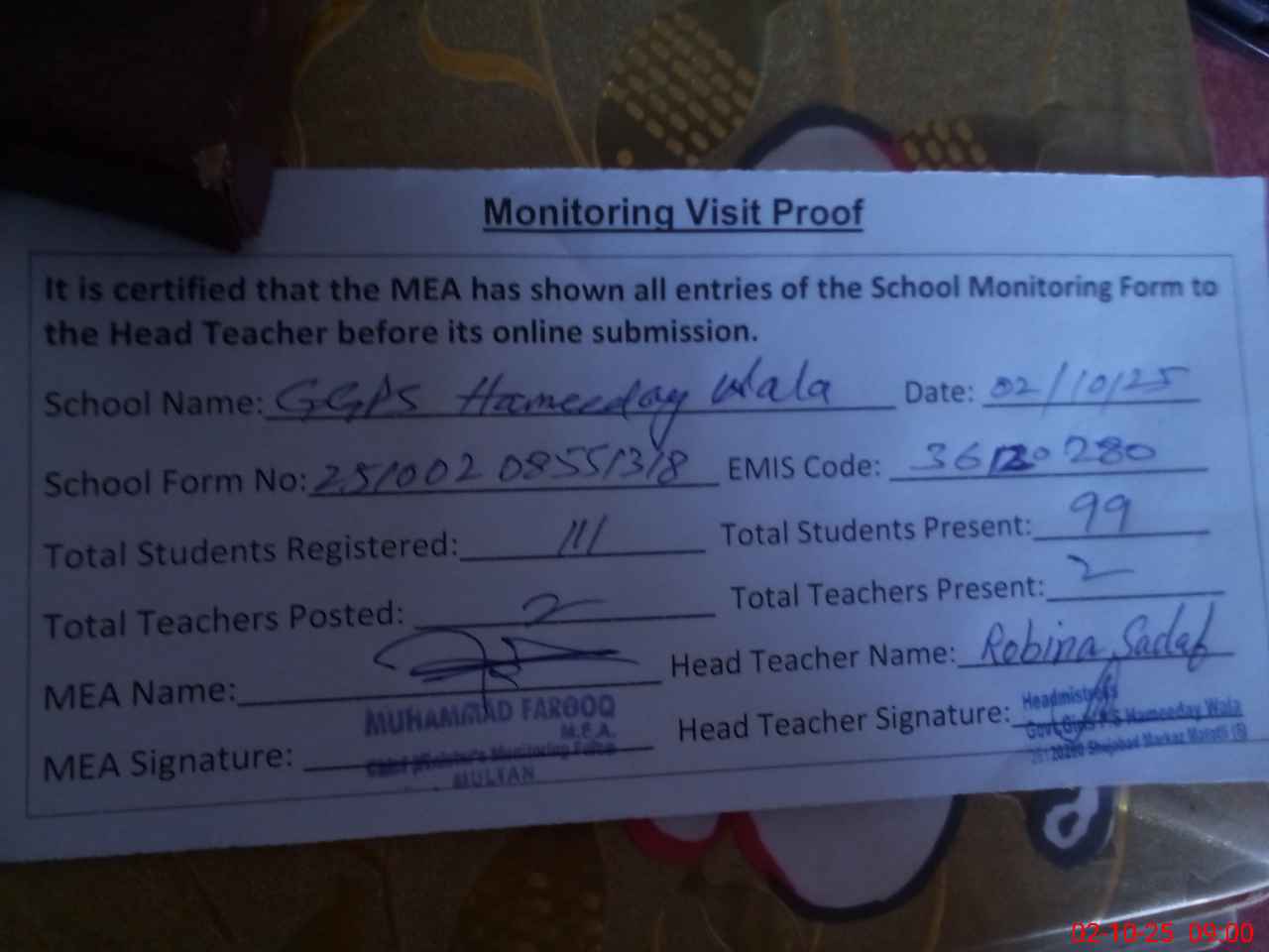 | EMIS Code: 36120280 | Name of School: GGPS HAMEEDAY WALA SHUJABAD DISTT. MULTAN | |||