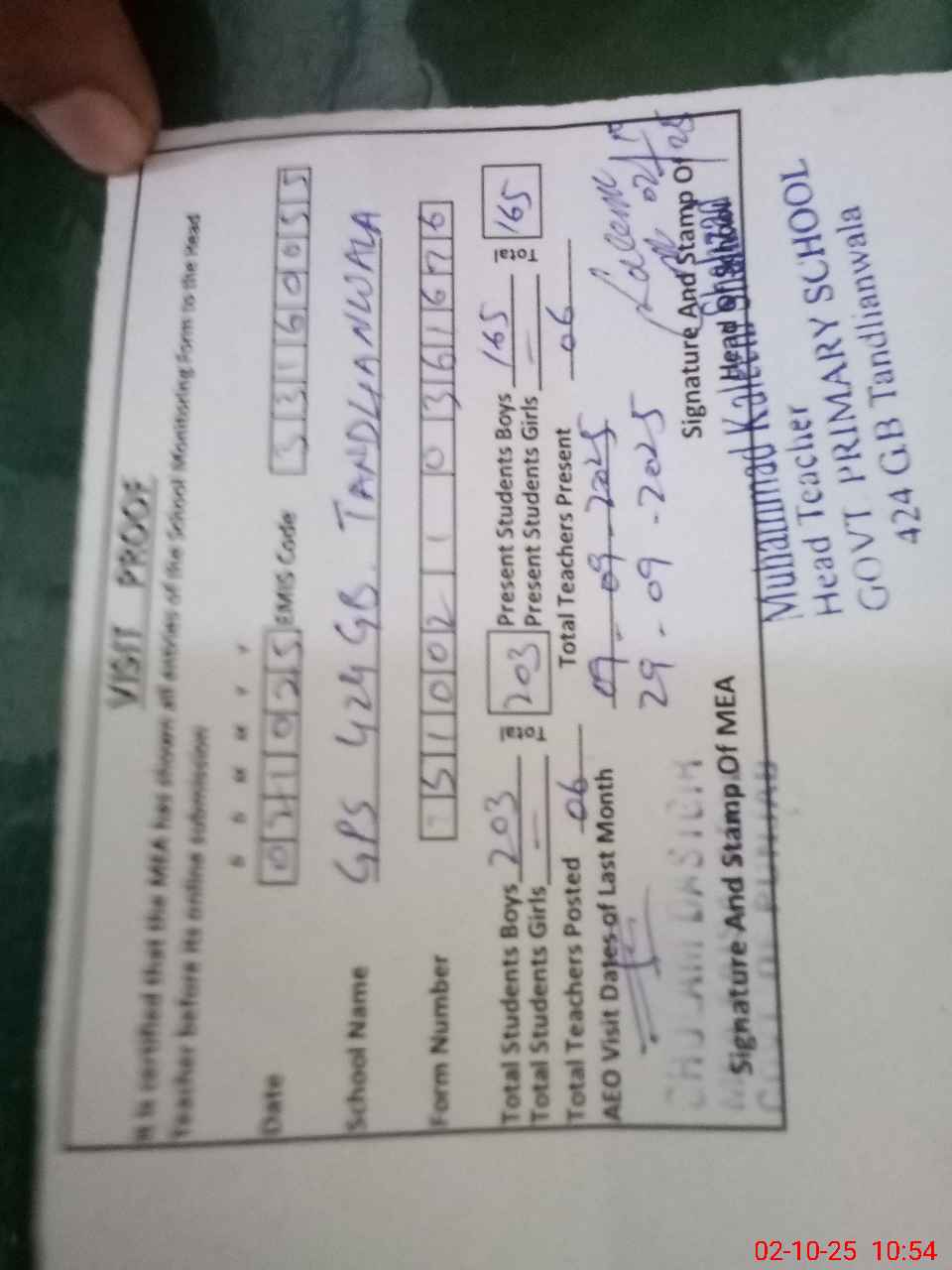 | Attendance Register | Head Teacher | MEA with School | Visit Proof |