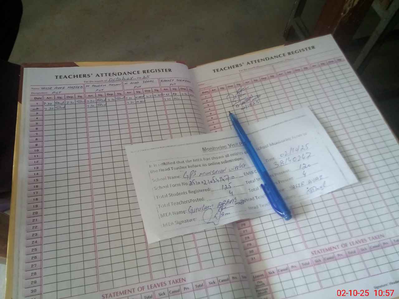 | Attendance Register | Head Teacher | MEA with School | Visit Proof |