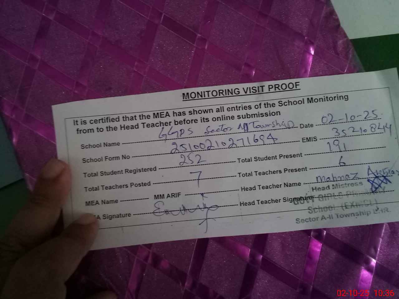 | Attendance Register | Head Teacher | MEA with School | Visit Proof |