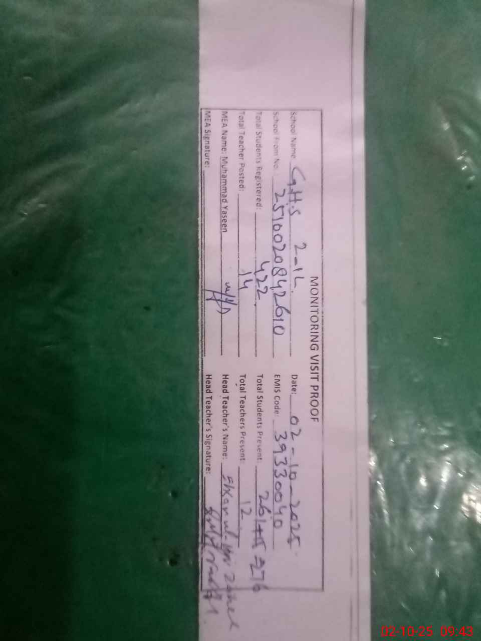 | Attendance Register | Head Teacher | MEA with School | Visit Proof |