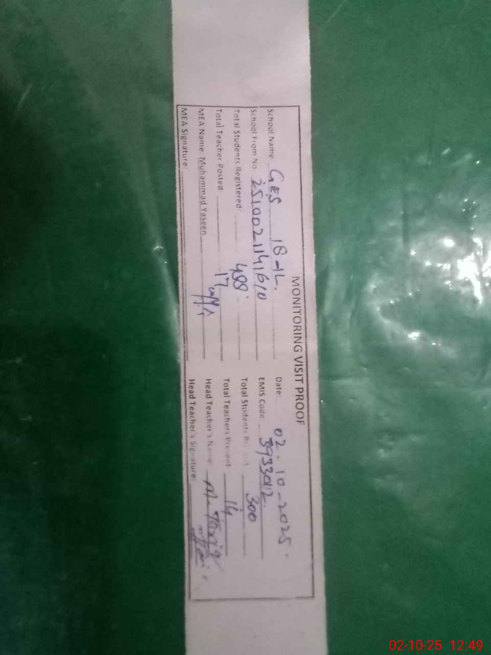 | Attendance Register | Head Teacher | MEA with School | Visit Proof |