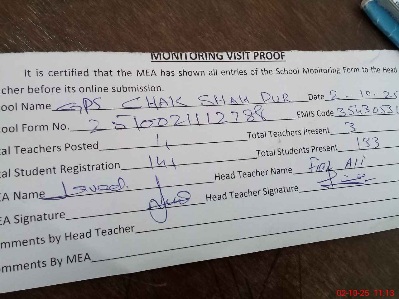 | EMIS Code: 35430534 | Name of School: GPS CHAK SHAH PUR | |||