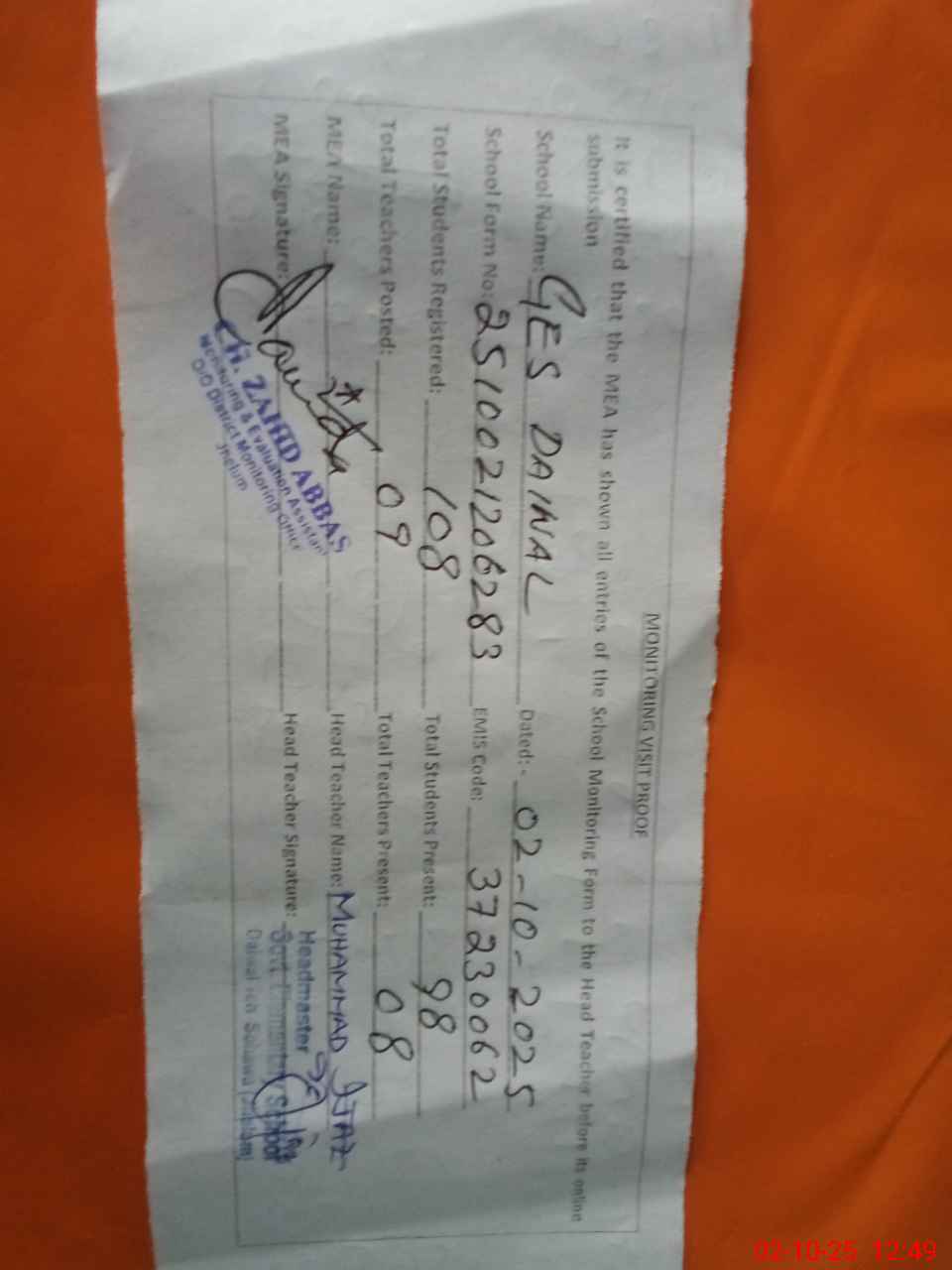 | Certified that this School was Inspected by the Undersigned MEA/DMO Today and the Information Stated Above is as Per Record. | |||||