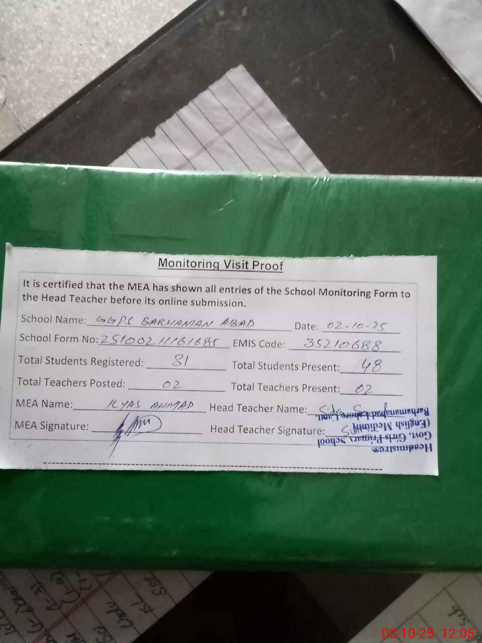 | EMIS Code: 35210688 | Name of School: GGPS BARHAMAN ABAD | |||