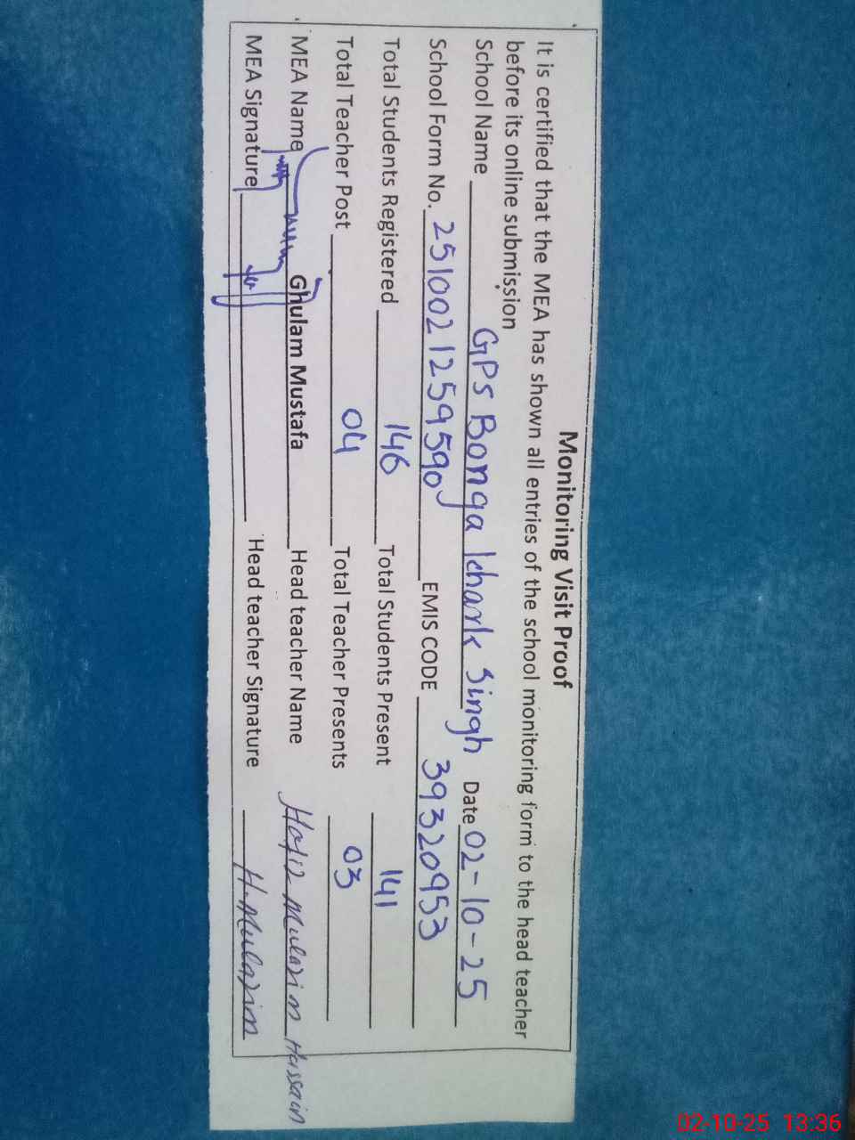 | Attendance Register | Head Teacher | MEA with School | Visit Proof |