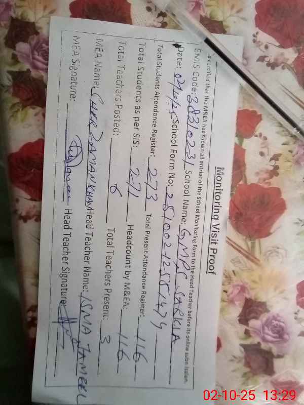 | Attendance Register | Head Teacher | MEA with School | Visit Proof |
