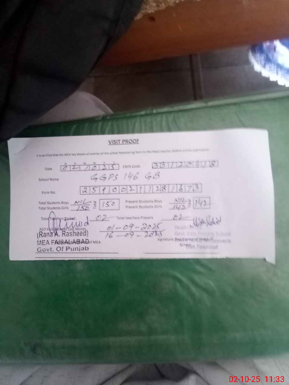 | EMIS Code: 33120418 | Name of School: GGPS CHAK 146 GB LUNDIANWALA | |||