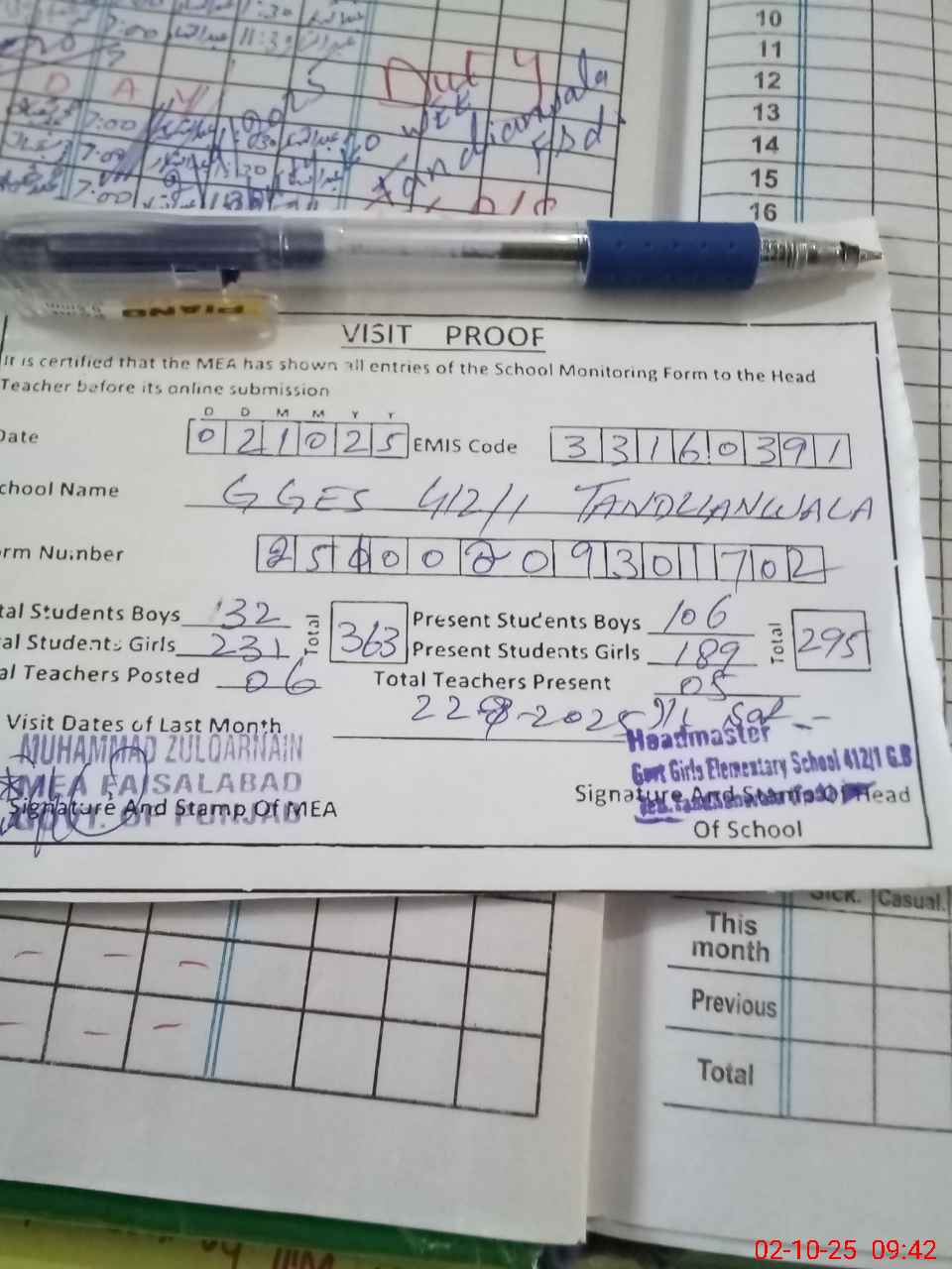 | Attendance Register | Head Teacher | MEA with School | Visit Proof |
