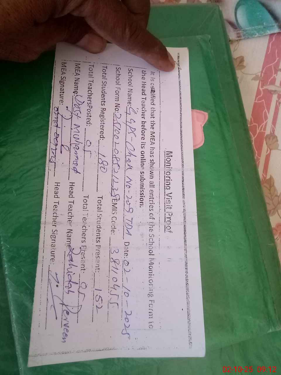 | Attendance Register | Head Teacher | MEA with School | Visit Proof |