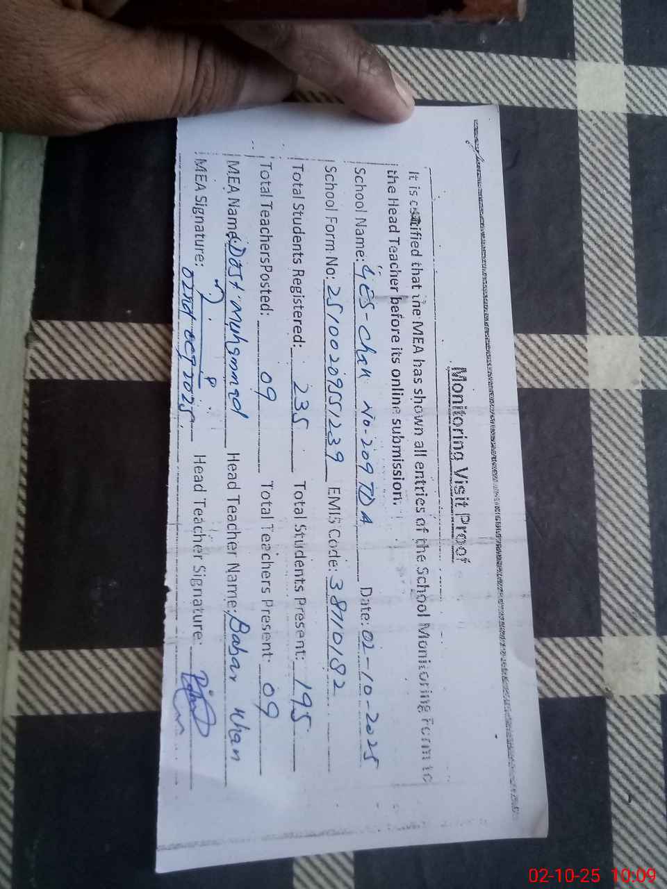 | EMIS Code: 38110182 | Name of School: GES CHAK NO 209 TDA | |||