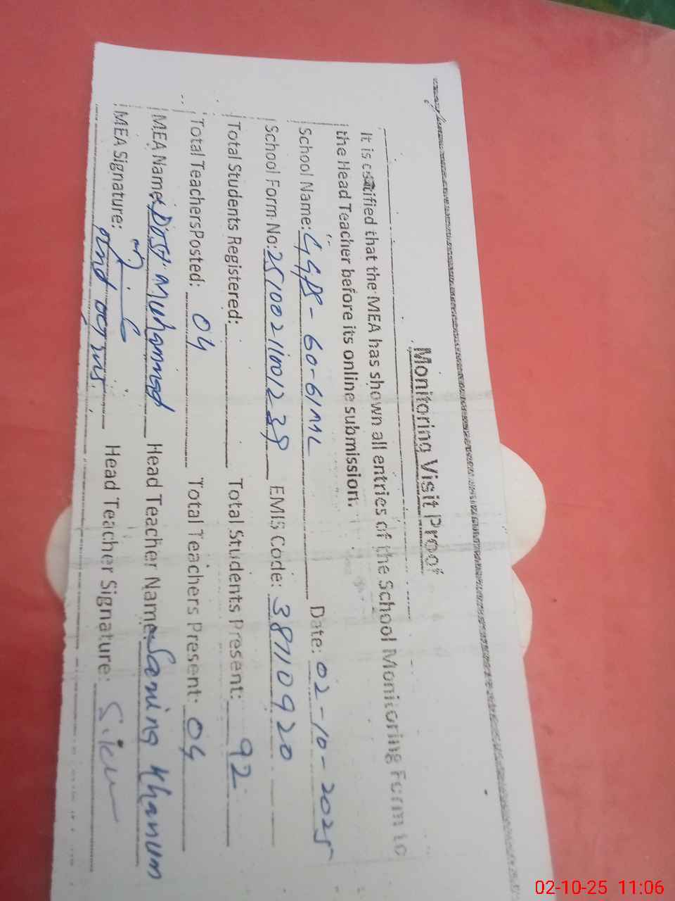 | Attendance Register | Head Teacher | MEA with School | Visit Proof |