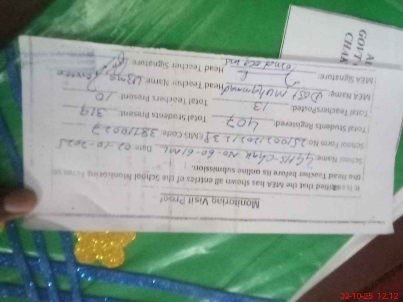 | Attendance Register | Head Teacher | MEA with School | Visit Proof |
