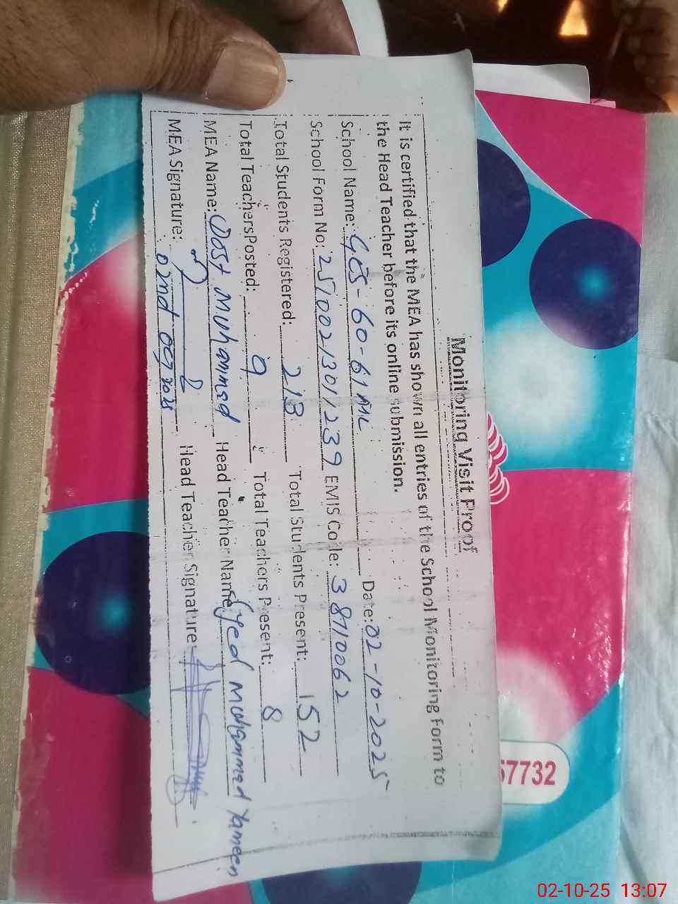 | EMIS Code: 38110062 | Name of School: GES CHAK NO.60-61 ML | |||
