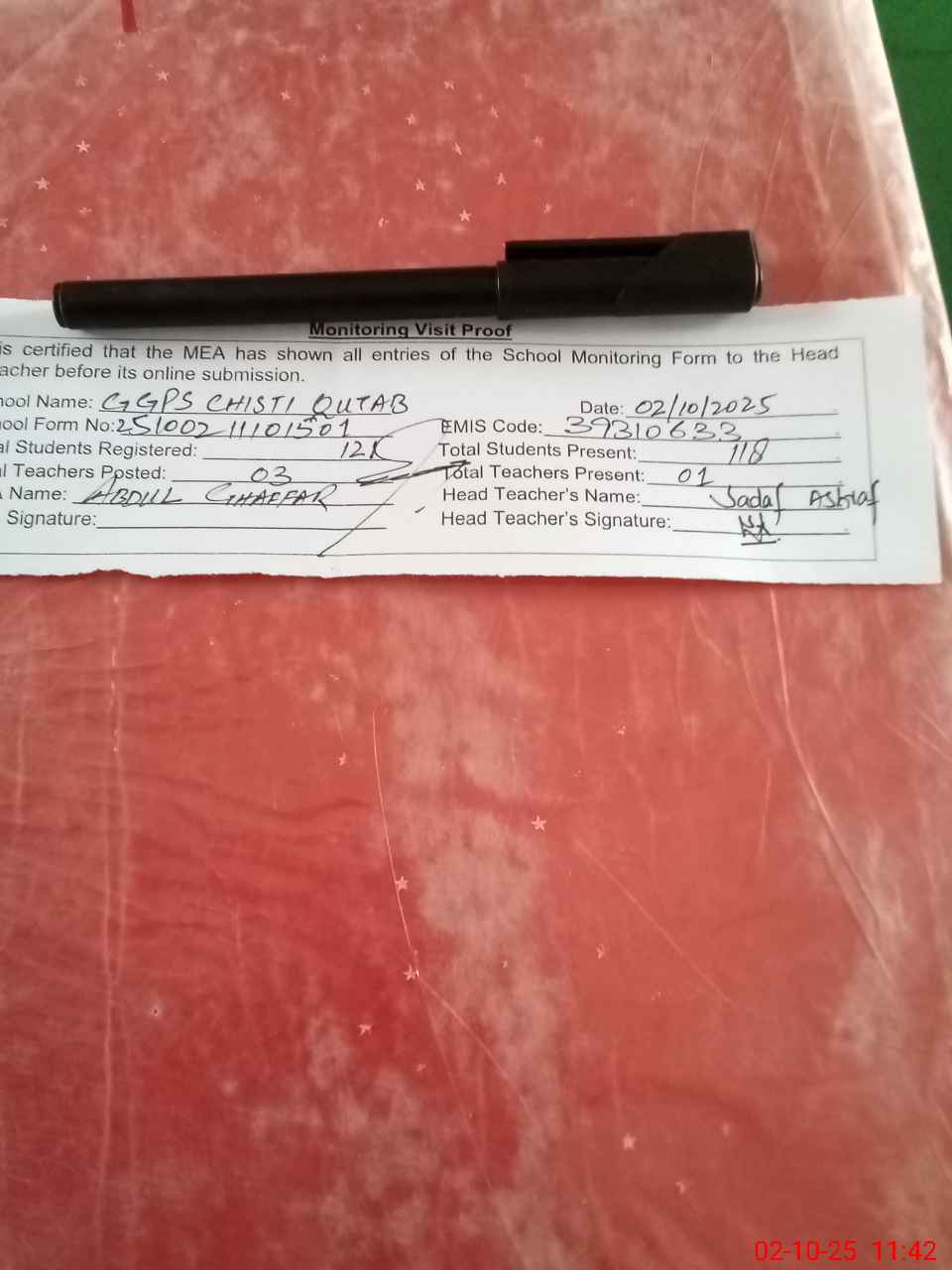 | Attendance Register | Head Teacher | MEA with School | Visit Proof |