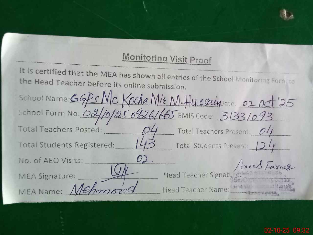 | Attendance Register | Head Teacher | MEA with School | Visit Proof |