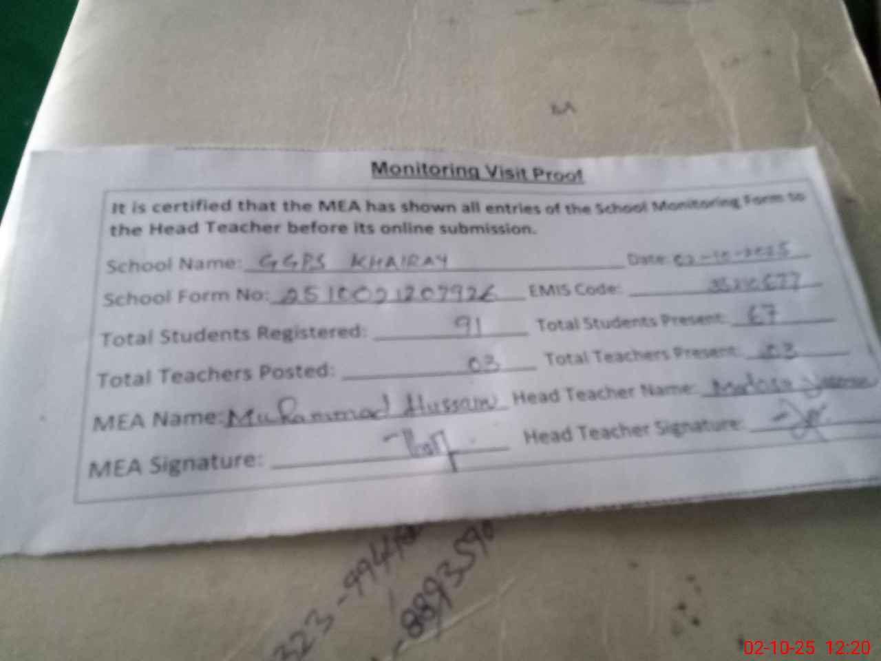 | EMIS Code: 35210677 | Name of School: GGPS KHAIRAY | |||
