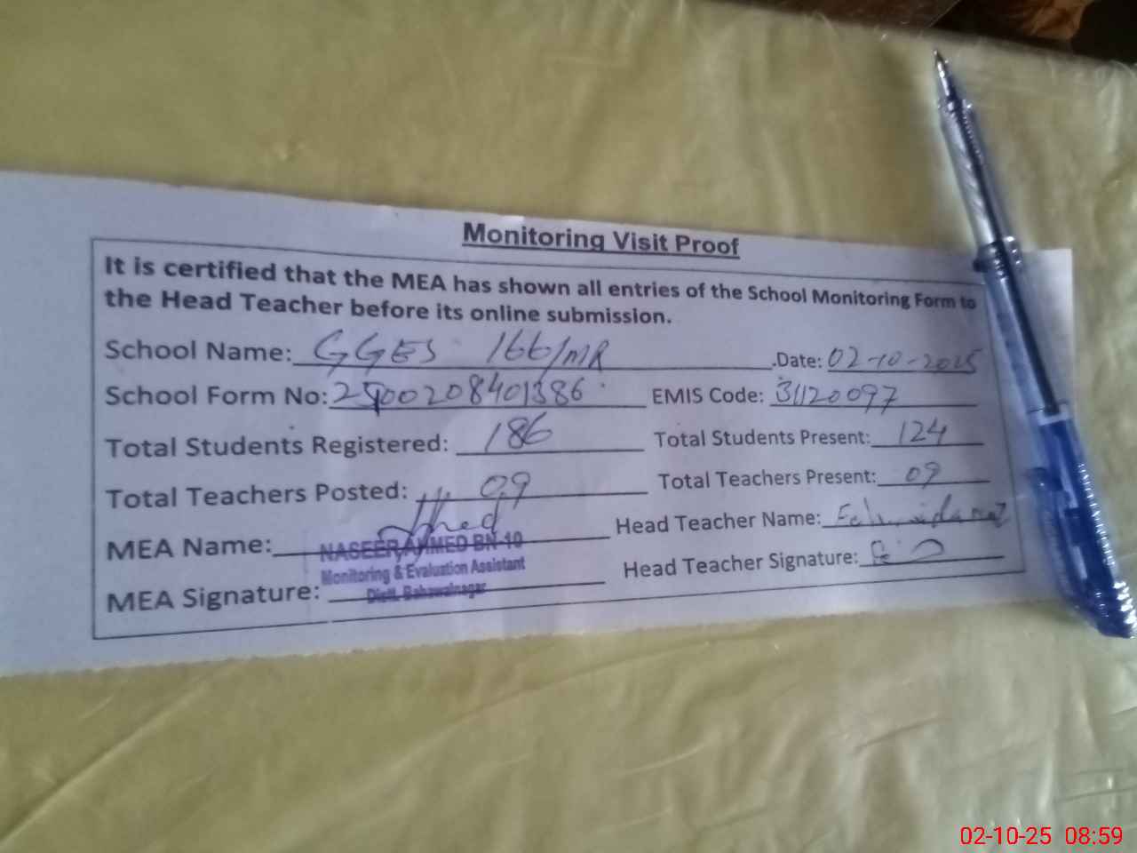 | Attendance Register | Head Teacher | MEA with School | Visit Proof |