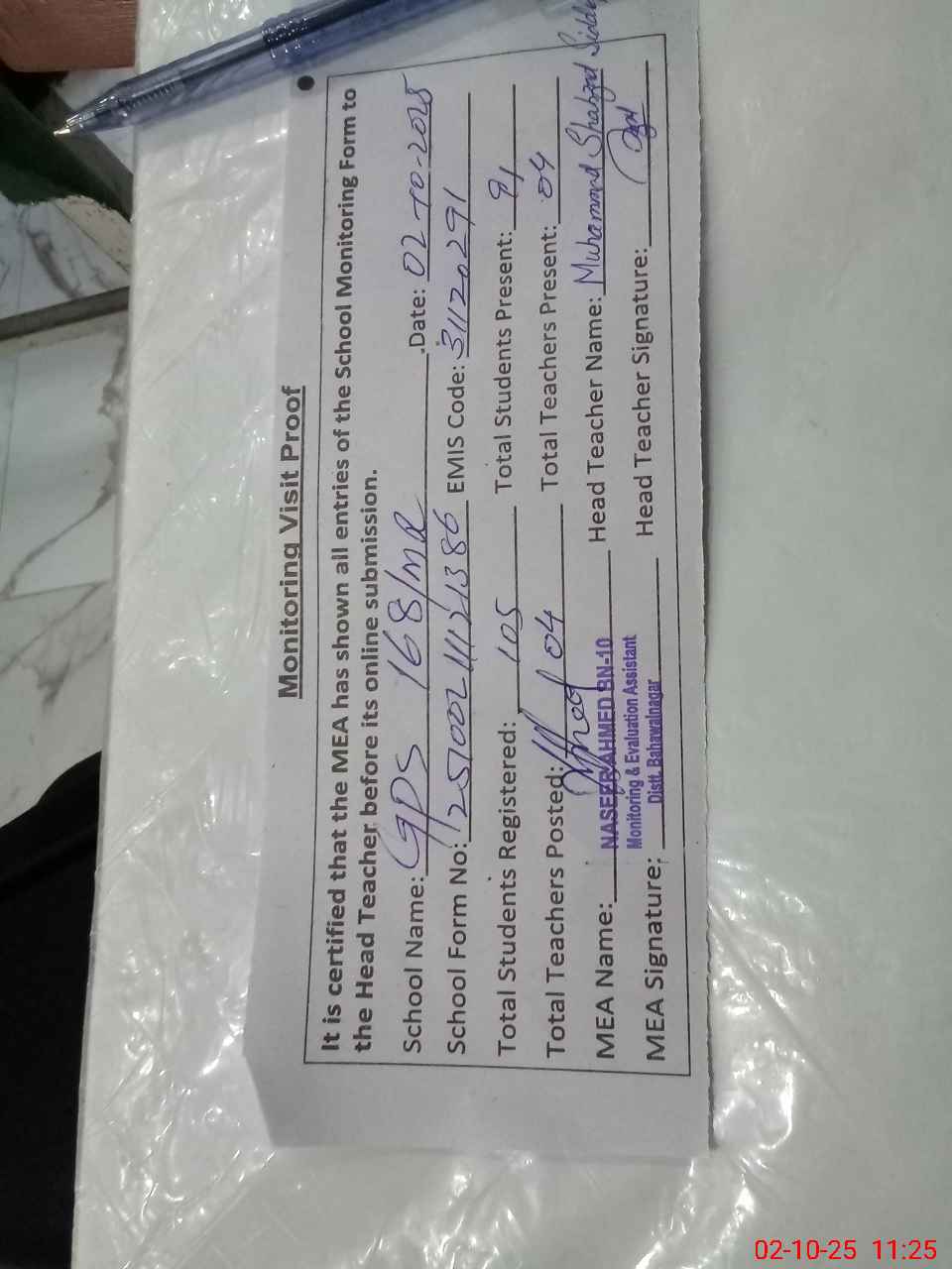 | Attendance Register | Head Teacher | MEA with School | Visit Proof |
