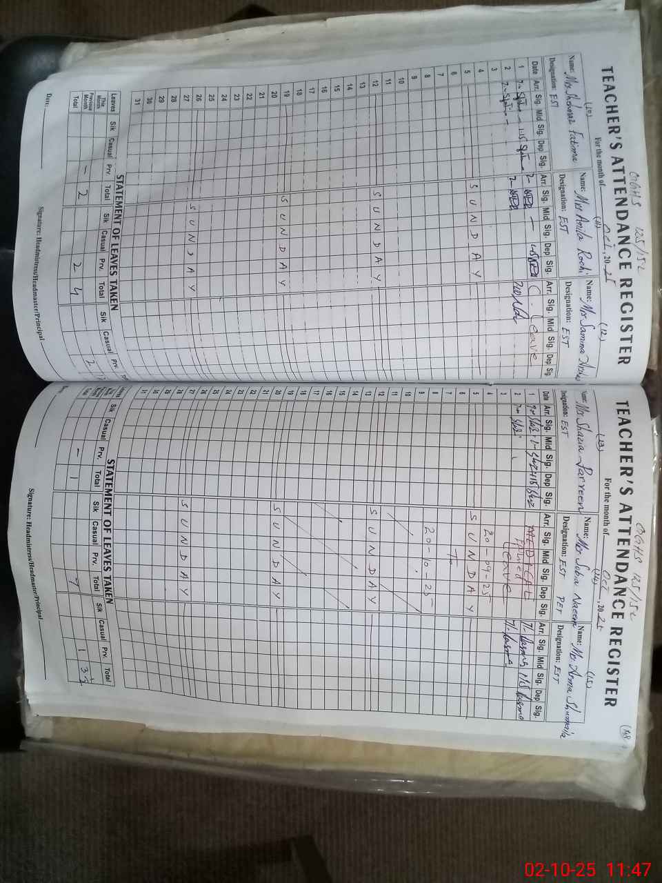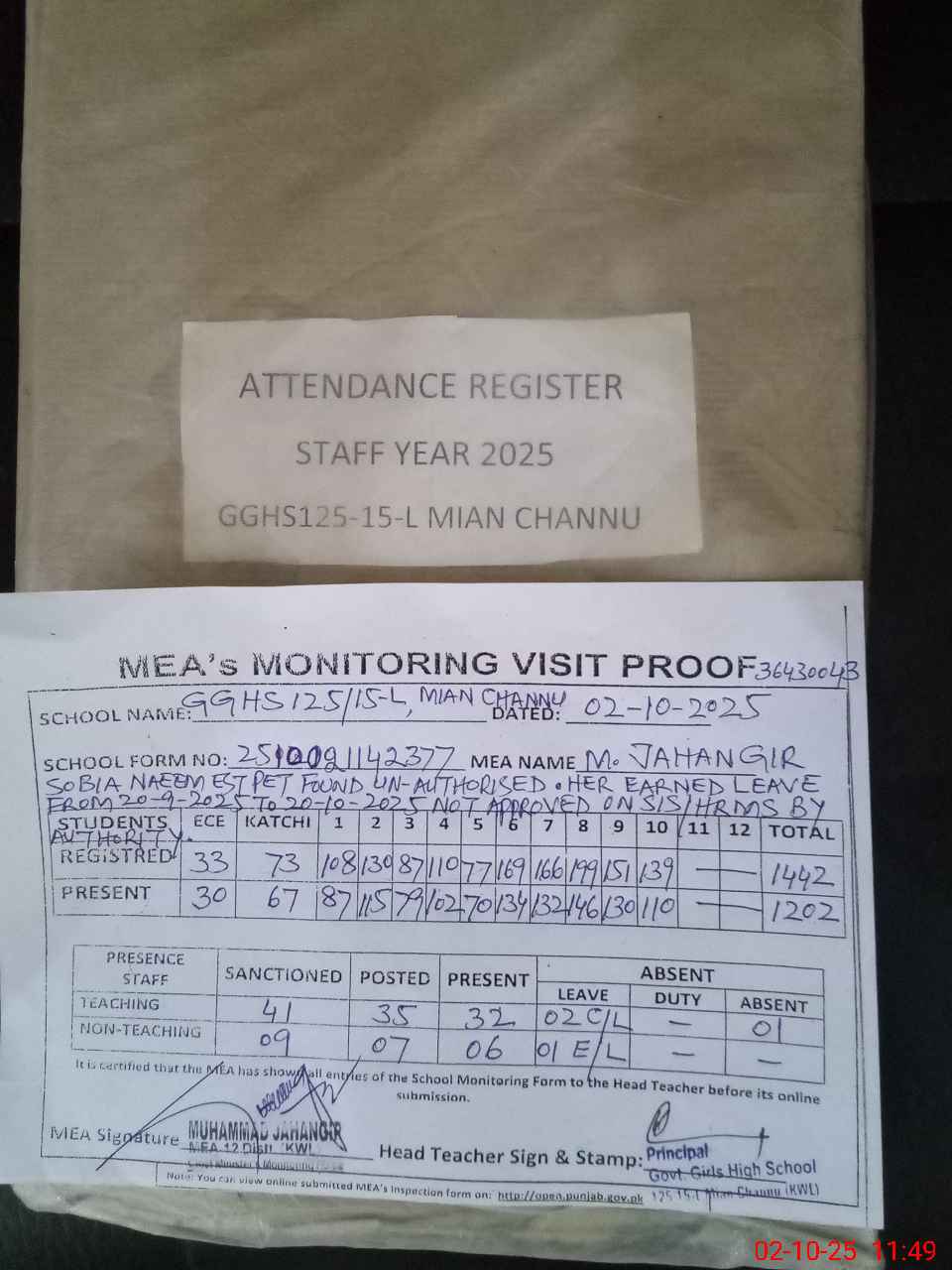 | Remarks (Use Separate Page if Required): SOBIA NAEEM EST PET FOUND UN AUTHORISED ABSENT FROM DUTY HER EARNED LEAVE STARTING FROM 20 SEPTEMBER 2025 TO 20 OCTOBER 2025 IS NOT SANCTIONED ON SIS HRMS BY AUTHORITY SMC REGISTER IS UPTO 08 JULY 2025 IS MAINTAINED AFTER THIS NO ENTRY SCHOOL HEALTH AND NUTRITION SUPERVISOR LAST VISIT ON 18 APRIL 2025 AFTER THIS NO VISIT RANDOM CLASS ECE IS NOW IN CLASS TWO THREE AND FOUR | |||||