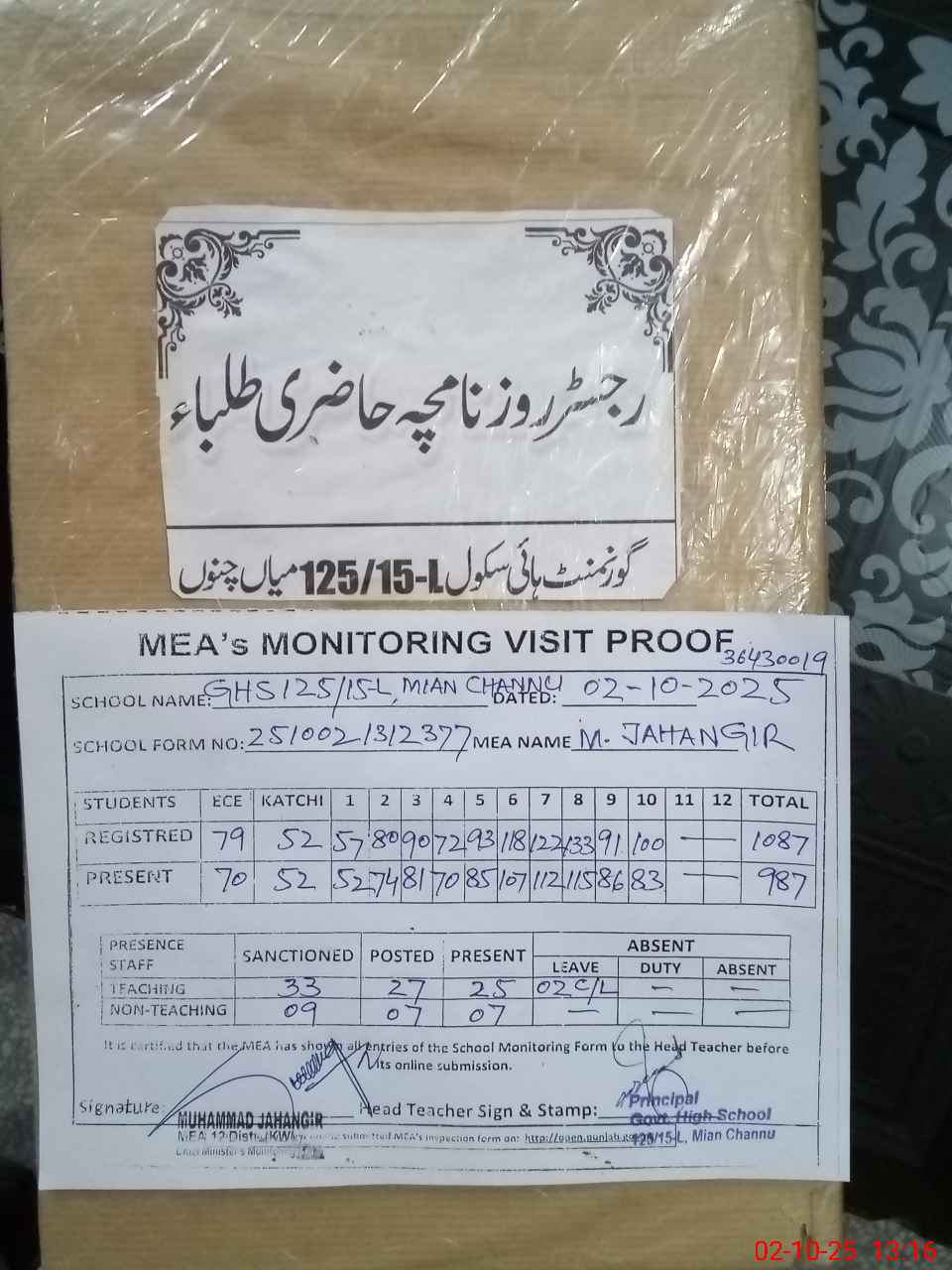 | Remarks (Use Separate Page if Required): LESSON PLANS ARE NOT AVAILABLE SCHOOL HEALTH AND NUTRITION SUPERVISOR LAST VISIT ON 28 APRIL 2025 AFTER THIS NO VISIT RANDOM CLASS SIX B IS NOW IN CLASS TEN ONLY TWO STUDENTS ARE PRESENT REMAINING ALL ARE NOW PASSED OUT FROM THIS SCHOOL | |||||