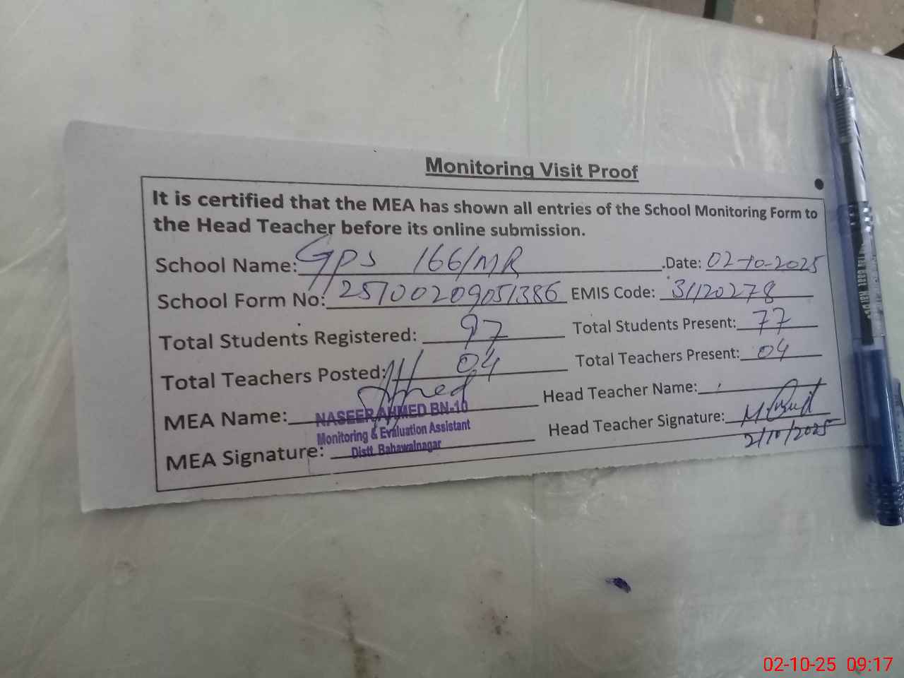 | EMIS Code: 31120278 | Name of School: GPS CHAK NO 166 M | |||
