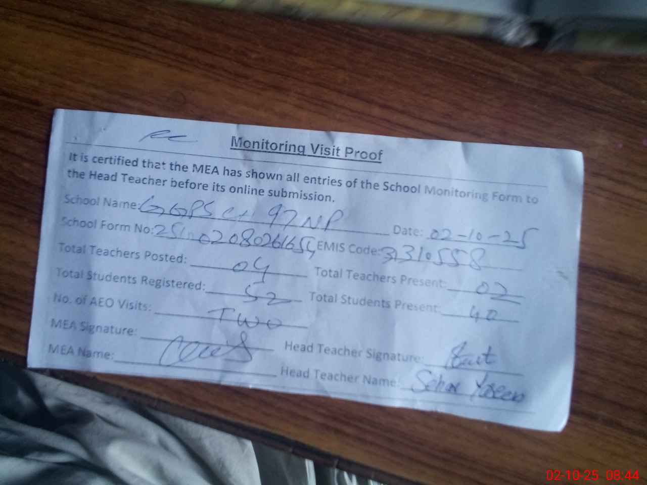 | Monitoring Date: 02-10-2025 | Start Time: 02-10-2025 08:26 AM | End Time: 02-10-2025 08:44 AM | Name of MEA: Kh**** Ah**** | |
