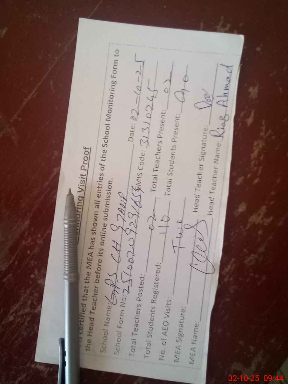 | Attendance Register | Head Teacher | MEA with School | Visit Proof |